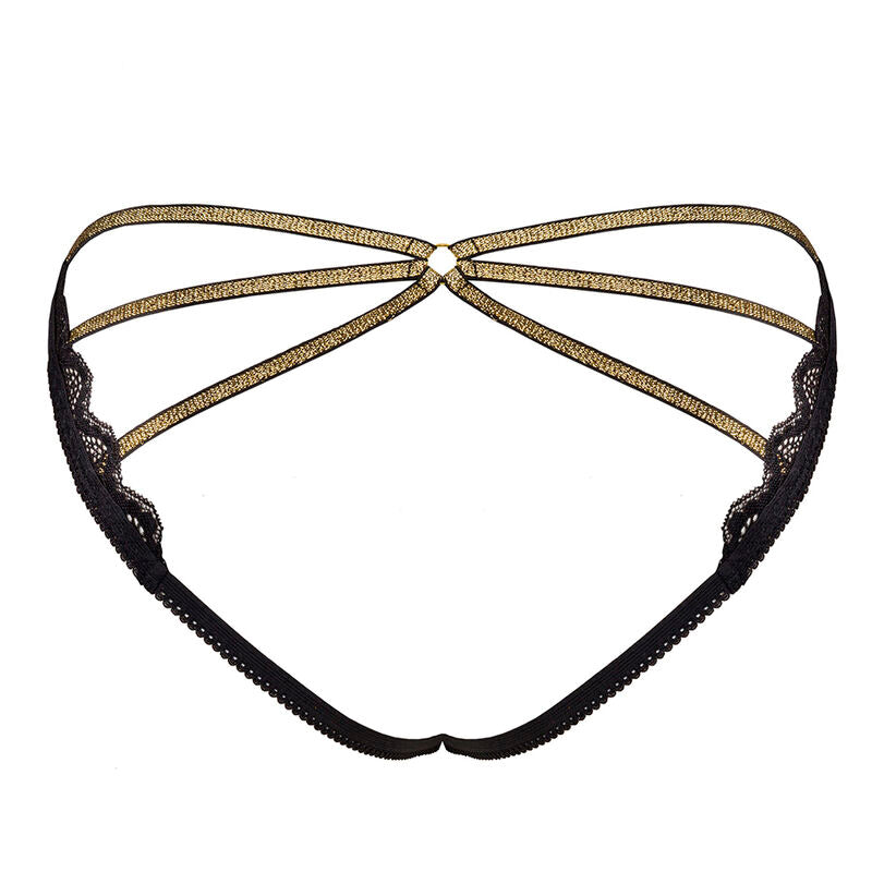 Unique and extraordinary black panties embody femininity, sex appeal, and sensuality. The concealed back, a combination of subtle lace trim and expressive straps that accentuate and highlight the buttocks, lends this style character and distinguishes it from other classic options. The Muled panty also strikes a balance between the delicacy of the lace and its dark black hue, partially punctuated by shimmering stripes.