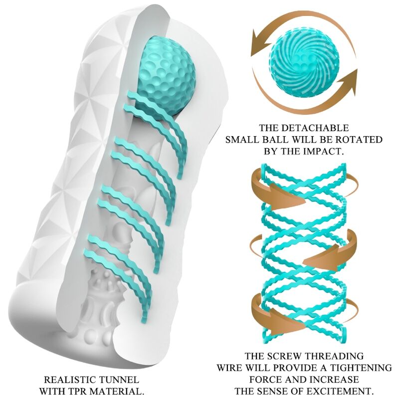 A small tool for gigantic masturbation fun! This transparent and reusable masturbator features a rotating spiral and a stimulation ball on the side. The rotating spiral makes the masturbator spin during penetration, and the ball on top stimulates just the right spot, giving you a new sensation. The sleeve has a stimulating and arousing texture inside that intensely and dynamically massages the penis during manual stimulation. You can use this stylish, skin-friendly masturbator again and again. Very easy to use and pure pleasure!