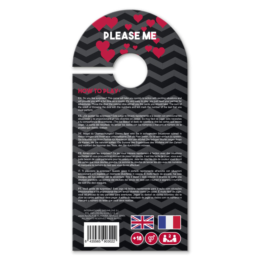 Magst du Überraschungen? Dieses Spiel bringt Sie schnell zum Handeln in aufregenden Situationen und bietet Ihnen eine unterhaltsame Zeit als Paar. Es ist sehr einfach zu spielen, Sie brauchen nur Ihren Abenteuerpartner. Wirf den Würfel! Die farbigen Würfel zeigen Ihnen die Karten, die Sie nehmen sollten. Die Ergebnissumme des Würfelns mit den Zahlen und markiert die Nummer des Tests, den Sie werfen müssen.