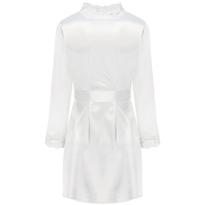 Ein außergewöhnlich schönes Unterwäsche-Set aus glänzendem Ecru-Satin, ein Bademantel mit Hemd, der bis zur Mitte des Oberschenkels reicht. Die Vorderseite und die langen Ärmel des in der Taille mit einem Gürtel gebundenen Morgenmantels sind mit wunderschöner Spitze verziert. T-Shirt mit dünnen, verstellbaren Trägern, verziert mit der gleichen Spitze an der Brust. Inklusive Tanga.